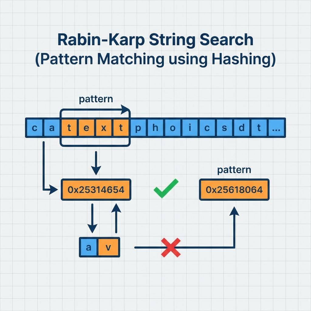 1. 라빈-카프(Rabin-Karp) 알고리즘은 긴 문자열 속에서 패턴을 찾을 때, 글자를 직접 비교하는 대신 패턴과 본문의 해시(Hash) 숫자값을 비교하여 탐색 속도를 극대화합니다.