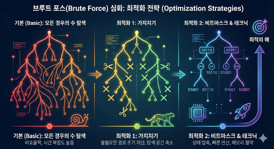 완전 탐색의 치명적인 단점은 입력 크기(N)가 커질수록 연산량이 폭발적으로 증가한다는 점입니다. 이를 극복하기 위해 브루트 포스는 백트래킹(Backtracking)으로 진화합니다.
