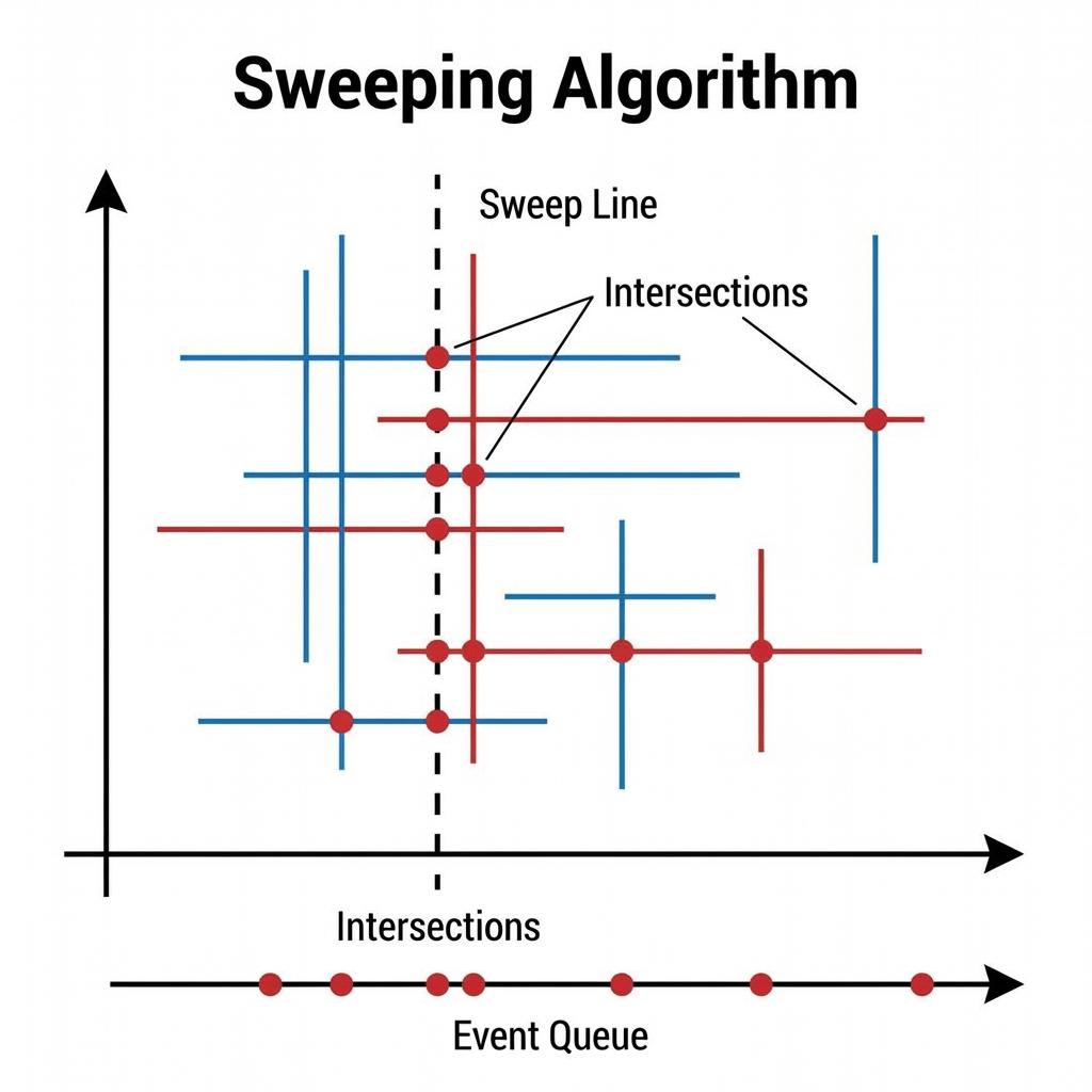 1. 스위핑(Sweeping) 알고리즘은 데이터를 특정 축(X좌표, 시간)을 기준으로 정렬한 뒤, 한쪽 방향으로 훑으며(Scan) 겹침 등의 이벤트를 처리하는 O(N log N) 최적화 기법입니다.