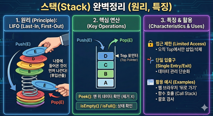 스택(Stack)은 가장 기본적이면서도 중요한 선형 자료구조 중 하나로, 데이터 처리 순서를 엄격하게 제어해야 하는 상황에서 핵심적인 역할을 수행한다. 스택은 후입선출(LIFO, Last In First Out)이라는 단순한 규칙을 기반으로 동작하지만, 이 규칙 덕분에 프로그램의 실행 흐름을 안정적으로 관리할 수 있다. 실제로 스택은 함수 호출 관리, 메모리 처리, 수식 계산, 알고리즘 문제 해결 등 컴퓨터 과학 전반에 걸쳐 광범위하게 활용된다. 이 글에서는 2026년 기준 최신 학습 흐름에 맞춰 스택 자료구조의 기본 개념부터 내부 동작 원리, 구조적 특징, 장단점, 그리고 다양한 활용 사례까지 체계적으로 깊이 있게 정리한다.