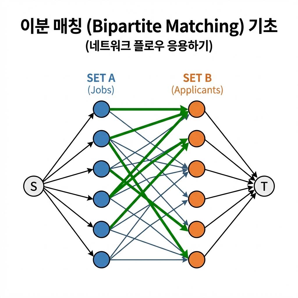 원래 최대 매칭을 구하는 정석적인 방법은 포드-풀커슨(Ford-Fulkerson)이나 에드몬드-카프(Edmonds-Karp) 같은 무거운 네트워크 플로우(최대 유량) 알고리즘을 사용해 파이프에 물을 흘려보내는 것입니다. 이분 그래프 구조에서 모든 파이프의 최대 용량(Capacity)을 1로 제한하면 그것이 곧 이분 매칭이 됩니다.