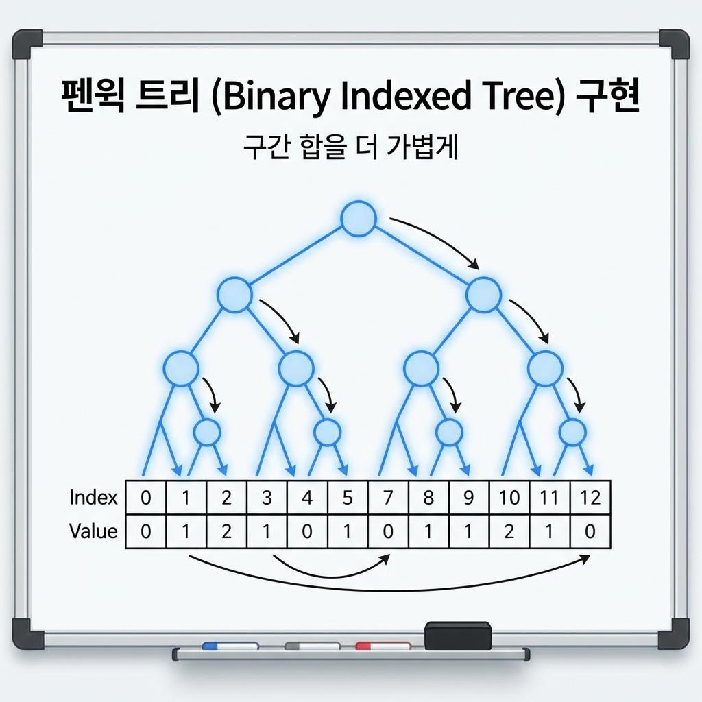 K & -K라는 천재적인 비트 연산을 통해 이진수의 마지막 1비트(LSB)를 추출하고, 이를 더하거나 빼는 방식으로 트리의 부모/자식 노드를 넘나들며 점프합니다.3. 코드가 극단적으로 짧고 메모리 효율이 뛰어나, 복잡한 범위 쿼리(최댓값/최솟값 등)가 아닌 단순 구간 누적 합을 다루는 코딩 테스트 문제에서 압도적인 위력을 발휘합니다.